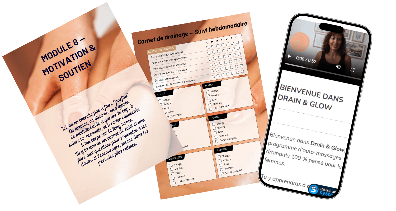 Un parcours 100 % en ligne pour t’apprendre ma méthode, pas à pas, pour activer ta lymphe, réduire les gonflements, alléger ton corps… et raviver ton glow.